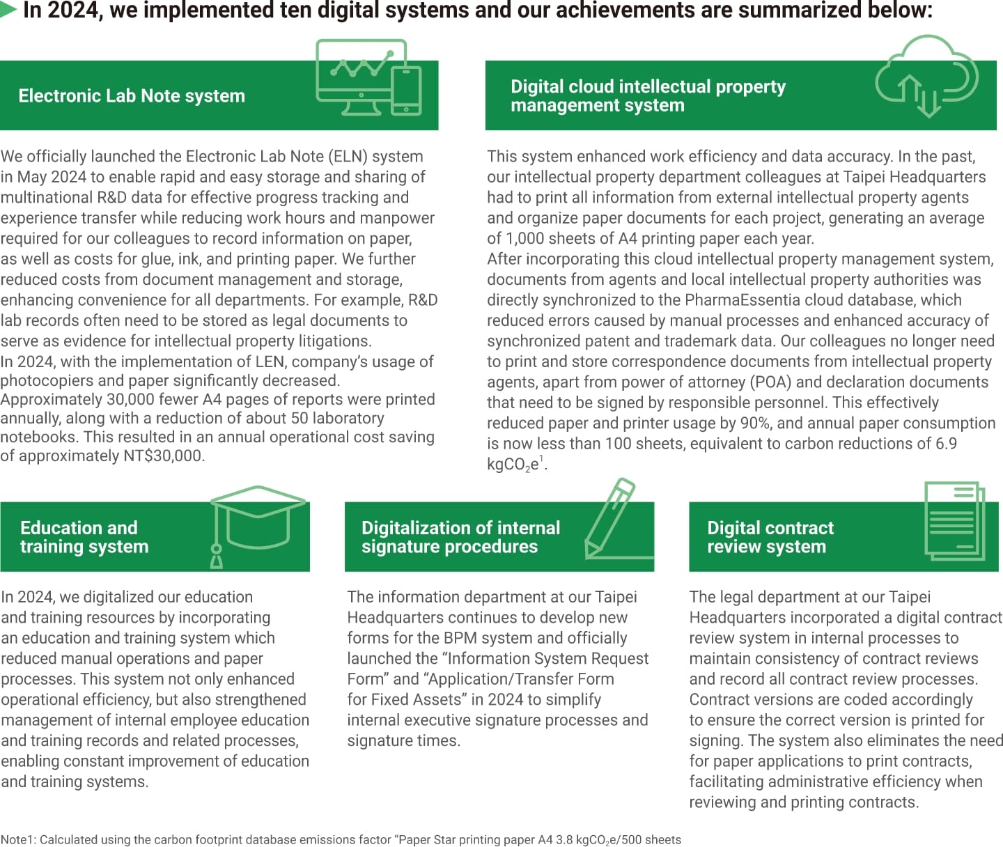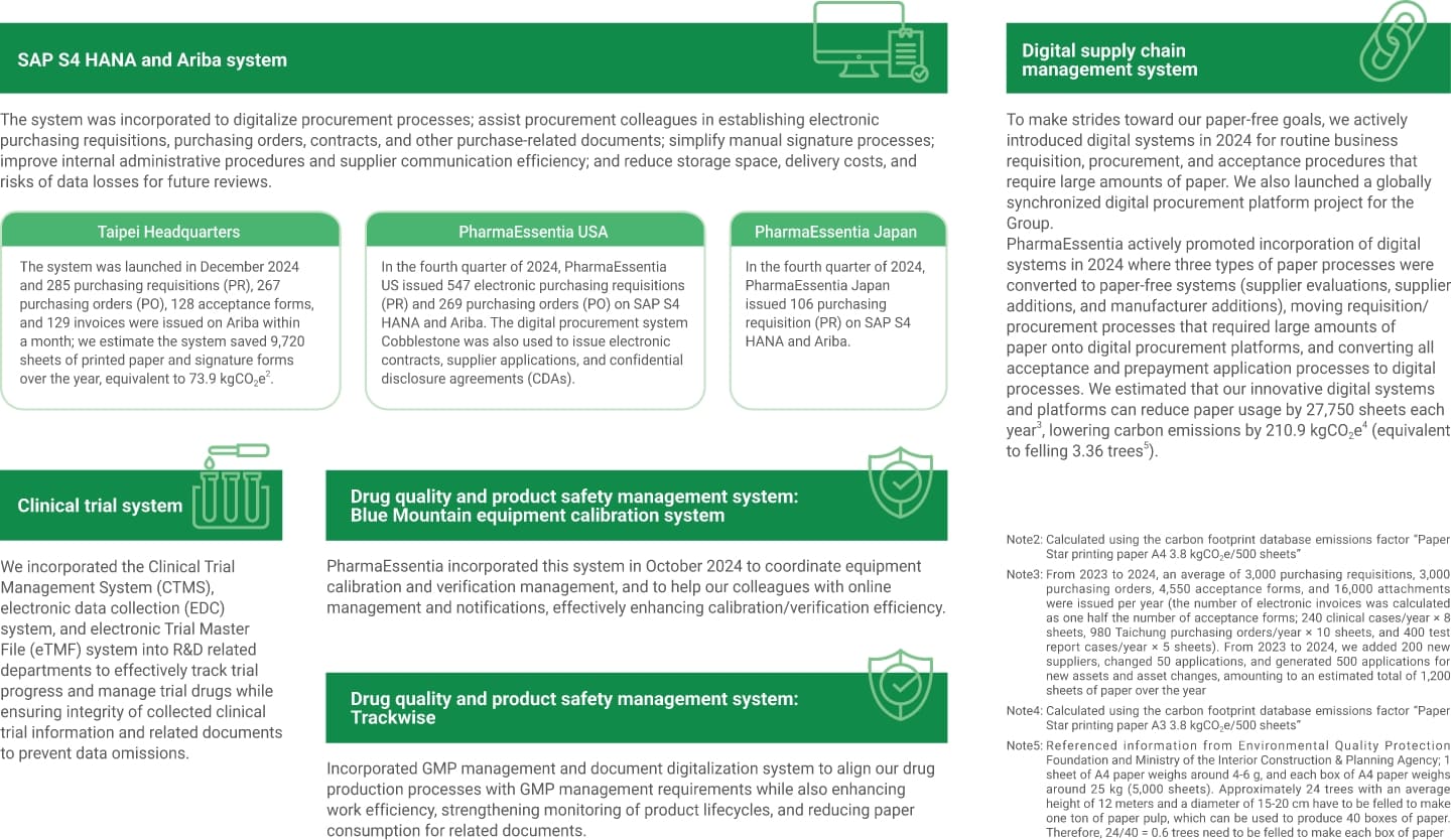 In 2024, PharmaEssentia introduced multiple digital systems for various operational aspects to minimize paper and resource consumption, thereby making strides toward paper-free operations.