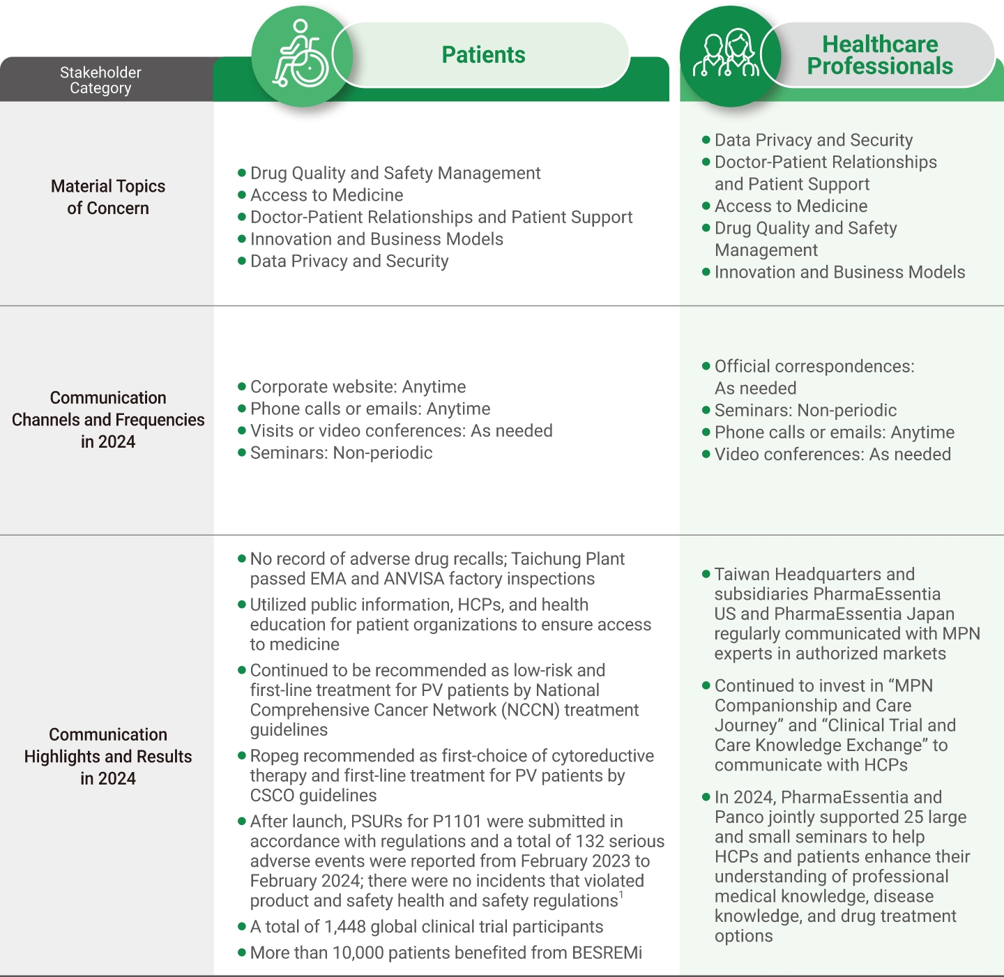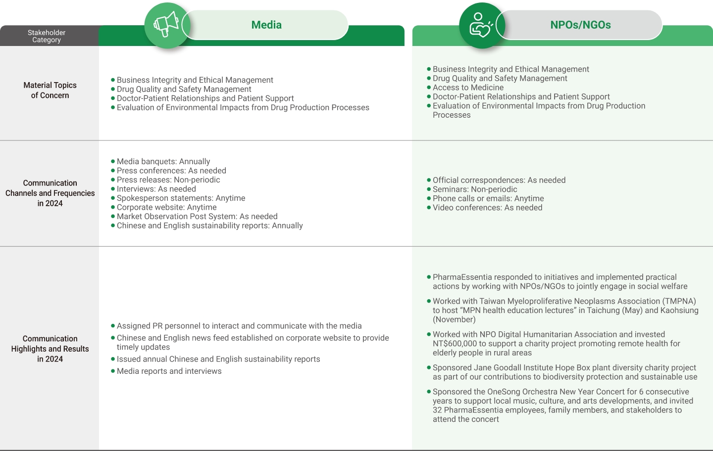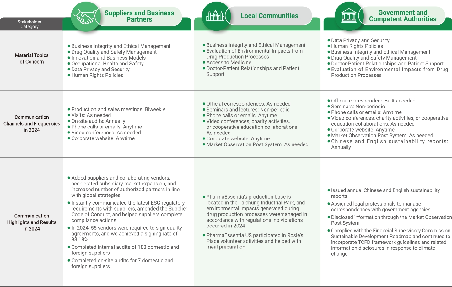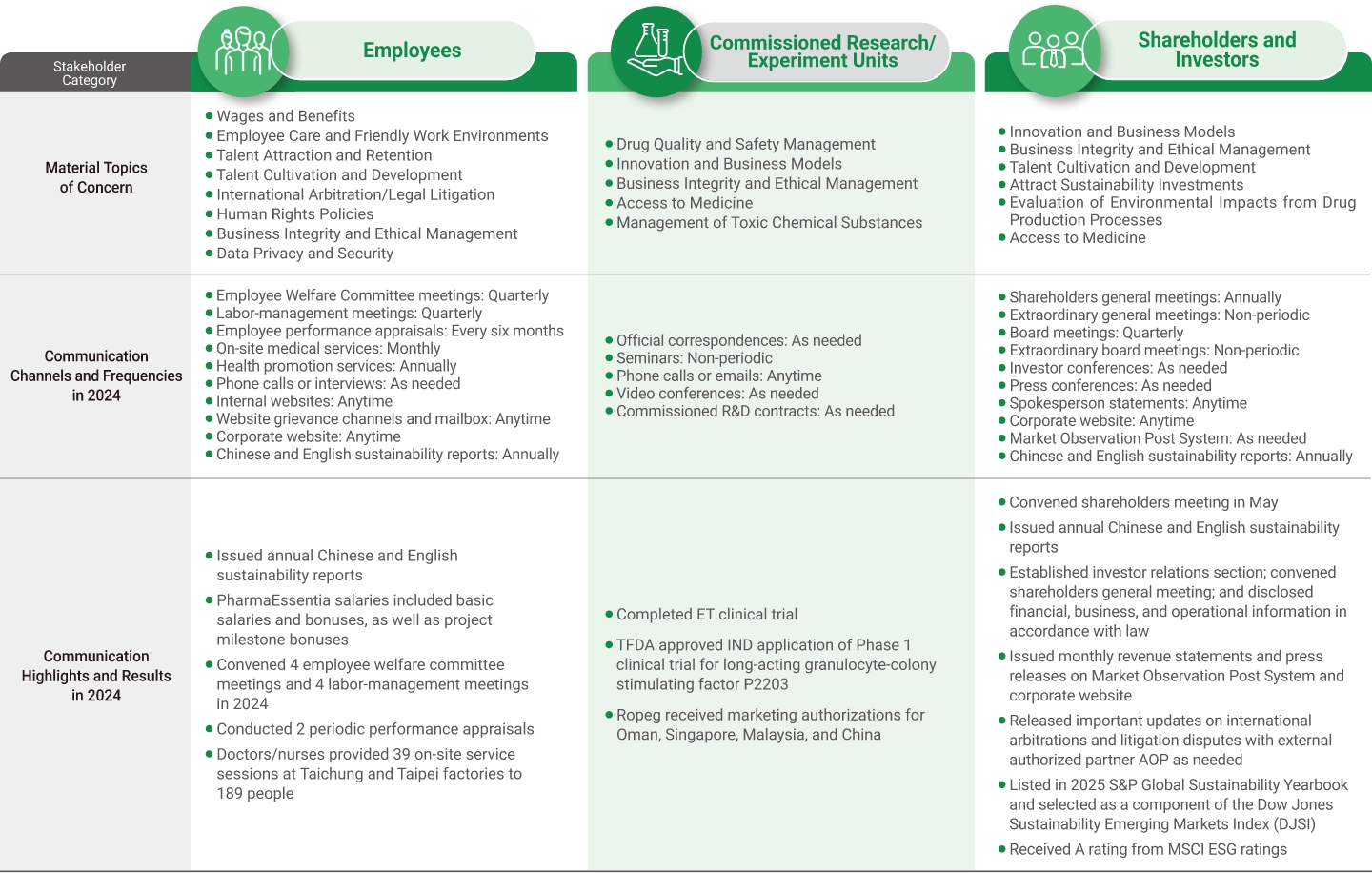 In 2024, PharmaEssentia continued to respond to sustainability topics of stakeholder concern using diverse stakeholder communication channels.