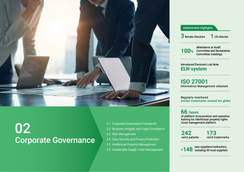 PharmaEssentia strives to improve its cor-porate governance mechanisms and pursue sustainable operations. We continue to strengthen Board functions and governance structures, and actively optimize risk controls to prevent negative impacts from affecting corporate operations. We also attach great importance to information security and pro-tection of personal information, and work to maintain corporate information security and personal information of patients.
